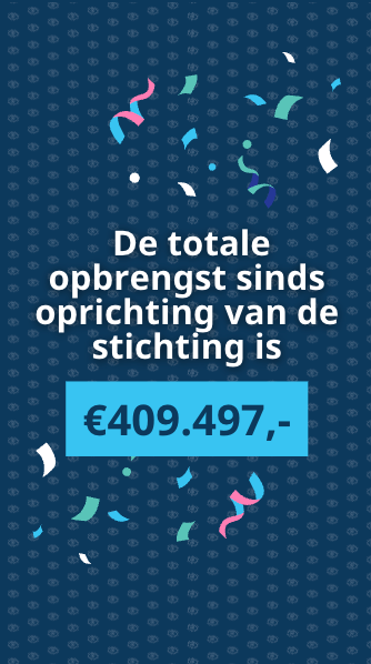 [Beeld ID: Een korte video op een donkerblauwe achtergrond met een oogpatroon. De witte tekst ‘De totale opbrengst sinds de oprichting van de stichting is’ verschijnt in beeld. Vervolgens verschijnt er een blauw vlak met het bedrag ‘€ 409.497,-’. De video eindigt met kleurrijke confetti die naar beneden valt.]